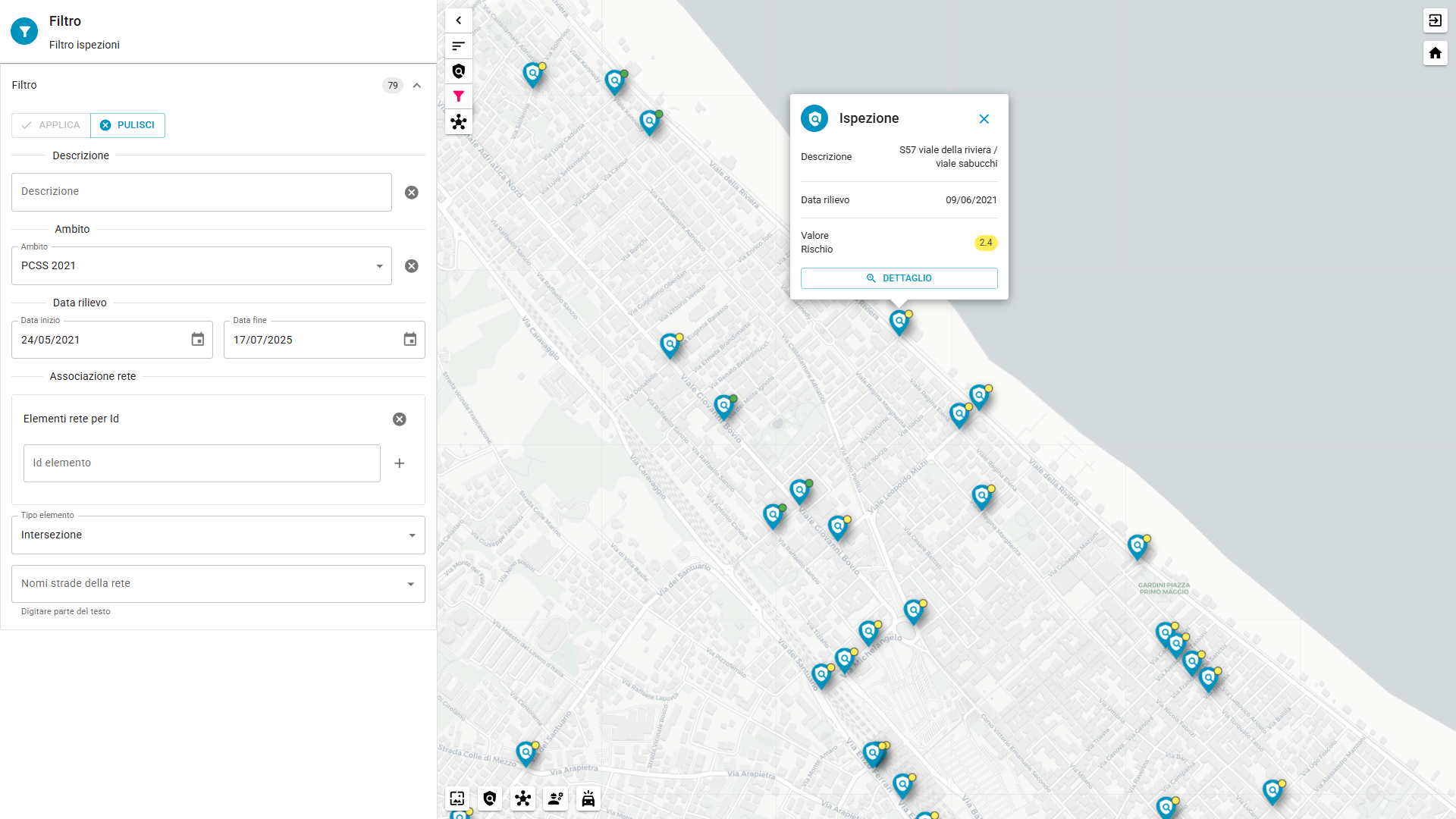 Con questo strumento si possono visualizzare su mappa le posizioni dei siti ispezionati con la possibilità di analizzarne le caratteristiche principali, la matrice di valutazione del rischio, le evidenze fotografiche e le proposte d’intervento, agevolando un piano di controlli sistematici lungo tutto il ciclo di vita di una strada.